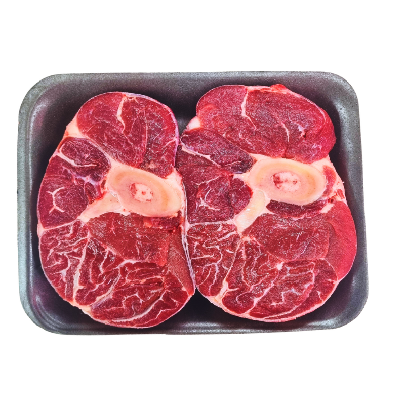 Beef Shin Bone in, is a cut that comes from the lower part of either the front or rear leg. Which is a well-exercised muscle & contains little fat with slow moist cooking methods over a low heat, the beef shin comes out super flavourful and tender making it the perfect cut for stews!
