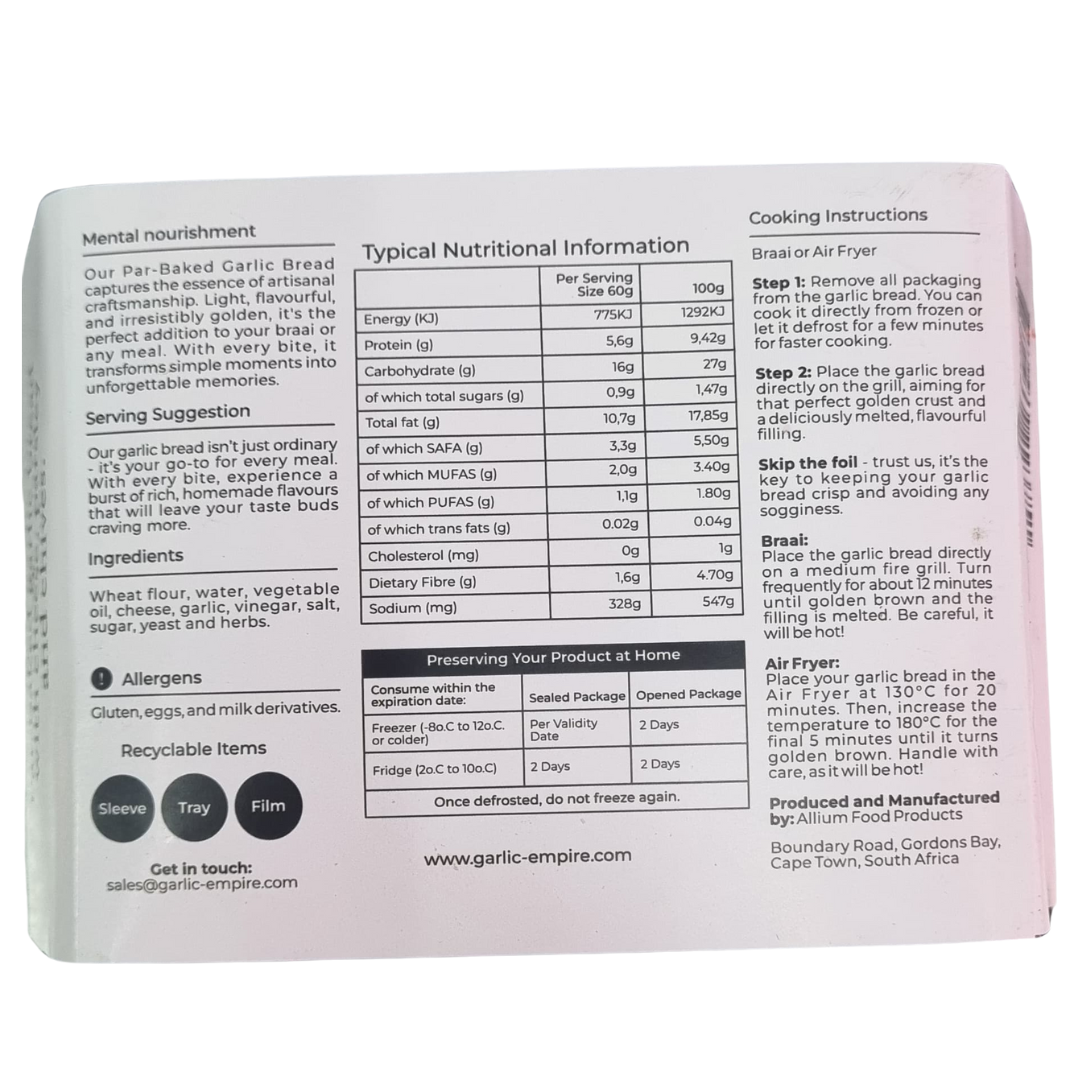 | Ingredients | Wheat flour, Water, Vegetable oil, cheese, garlic, vinegar,salt,sugar,yeast and herbs |